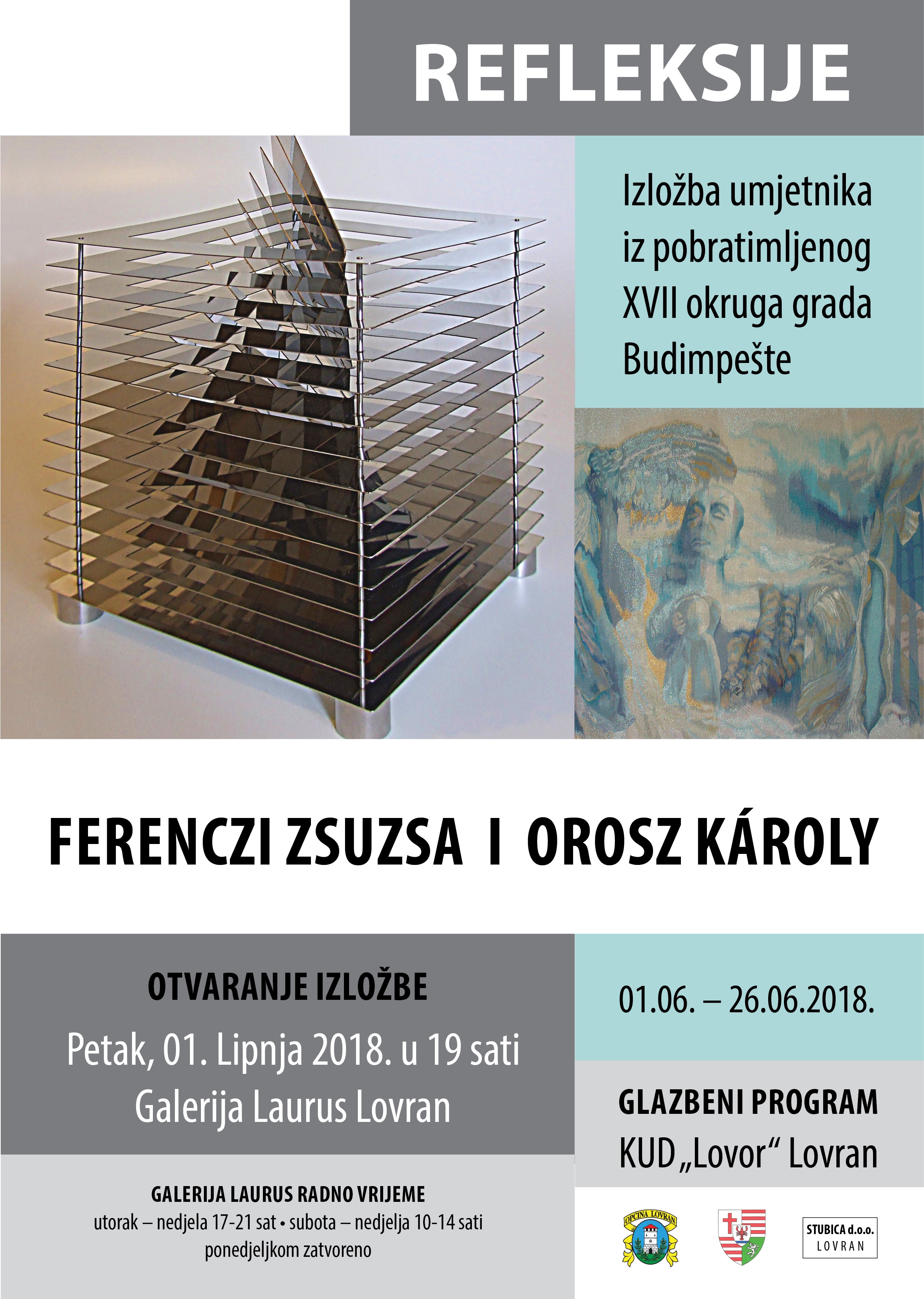 Pozivamo Vas na otvorenje izložbe pod nazivom “Refleksije” umjetnika Ferenczi Zsuzsa i Orosz Karoly, u petak, 01. lipnja 2018. godine, s početkom u 19,00 sati, u Galeriji Laurus Lovran.