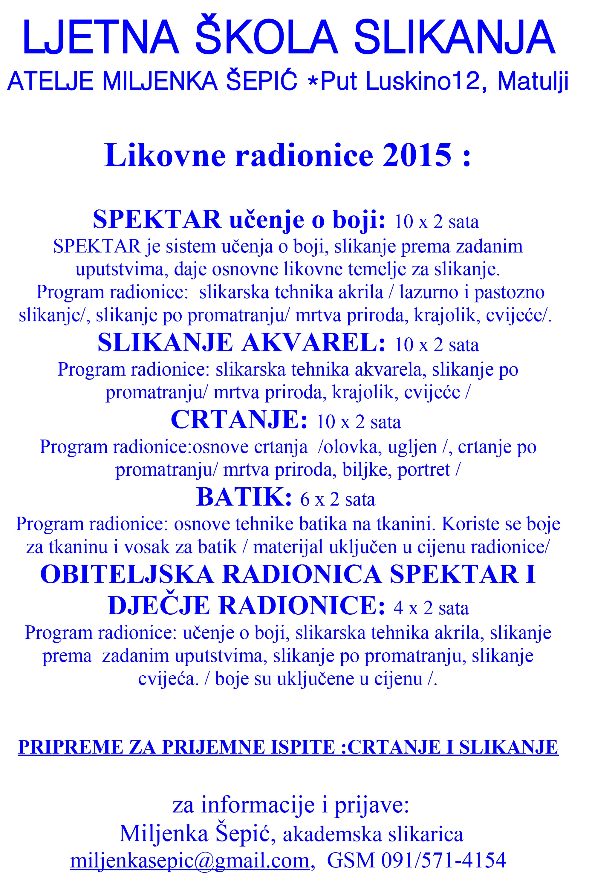 Ljetna škola slikanja, počinje od svibnja, a trajati će do rujna. Radionice se održavaju jedan puta tjedno od 17 do 19 sati, ili po dogovoru.Cijena radionice od 10 x 2 sata je 1000 kn. Obiteljske radionice namjenjene su djeci starijoj od 5 godina u pratnji odrasle osobe, cijena za 4 radionice je 400 kn, a u cijenu su uključene i boje. Sve ostale radionice, individualan rad i pripreme za prijemne ispite, po dogovoru.Informacije na: MILJENKA ŠEPIĆ, akademska slikarica, mob. 091/5714154
