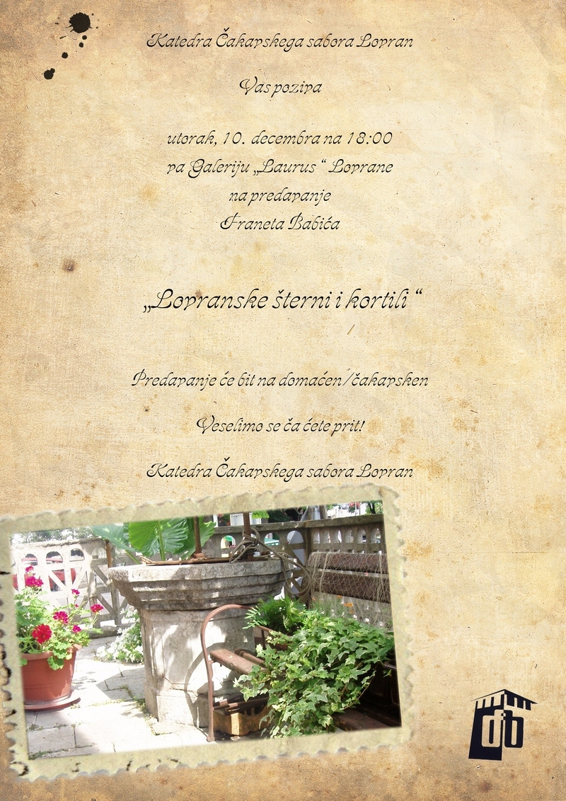 Katedra Čakavskog sabora Lovran Vas poziva u utorak, 10. prosinca u 2013.g. 18 h u galeriju “Laurus” na predavanje Franeta Babića“Lovranske šterni i kortili”. Predavanje će biti na čakavskom.