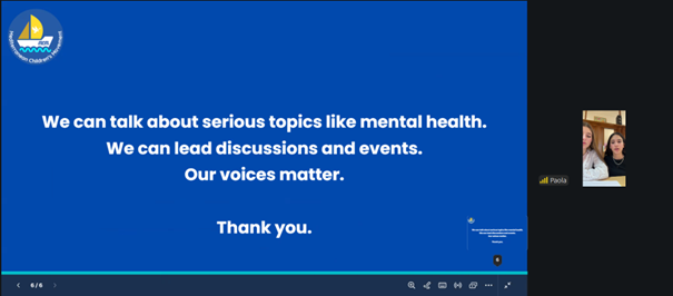 Na online generalnoj skupštini Paola Petrović i Veronika Anušić, članice 2. saziva Mediteranskog pokreta za dječju participaciju predstavile su čime su se bavile za vrijeme trajanja svog mandata u prethodnoj godini, posebice su se osvrnule na značaj webinara o mentalnom zdravlju djece na kojem su predstavile važnost podrške djeci u odrastanju od strane educiranih odraslih osoba.